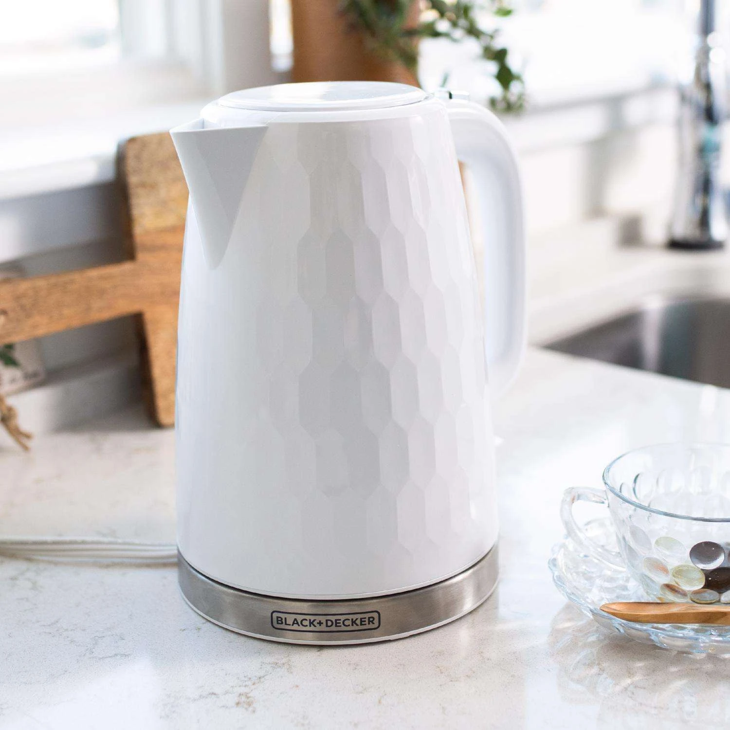 Premium design meets top performance. The Black+Decker Rapid Boil 1.7L Electric Cordless Kettle is part of the Honeycomb Collection, featuring a premium textured finish and stainless steel accents that will complement your kitchen aesthetic. And it delivers on performance. Rapid Boil Technology boils water more than 2x faster than a stovetop, delivering you fresh, hot water for tea, hot cocoa, instant meals, oatmeal, French press coffee and more! Plus, the 360 degree swivel base allows you to pick up and set down the kettle at any angle for easy, cord-free pouring. Other features include: illuminated water window, rapid boil zone (1-3 cups), boil/dry protection, on/off switch, safety locking lid, cord wrap, removable anti-scale filter. Premium textured finish – the Honeycomb collection brings an elegant look to your kitchen Rapid boil technology -The powerful heating element boils water quickly, saving you time in the kitchen. Easy fill water levels – internal markings and water window. Cord-free serving – easy transferring from counter to table. Automatic shutoff – peace of mind with every use. Operation starts and can be stopped with the simple on/off switch.