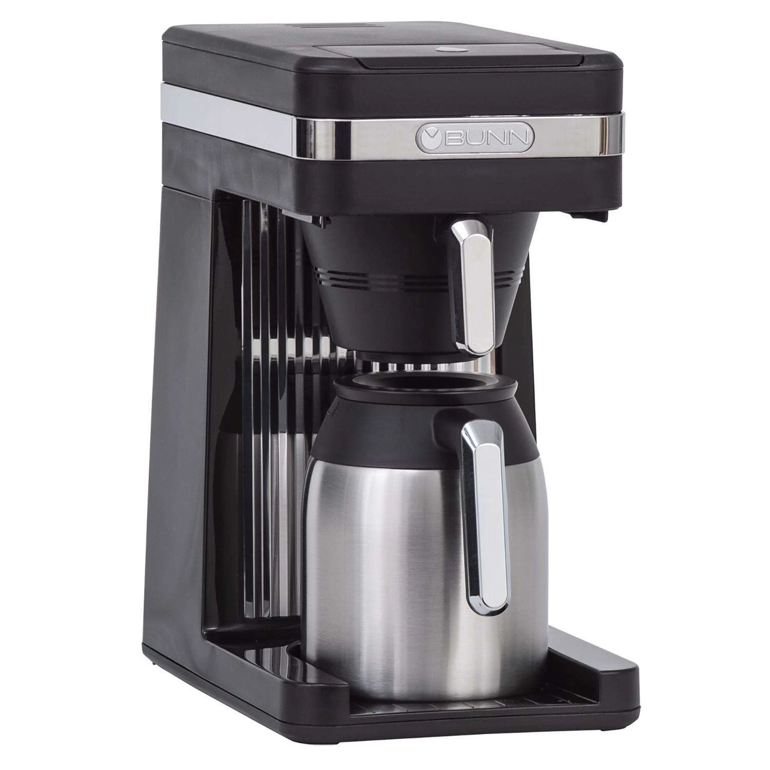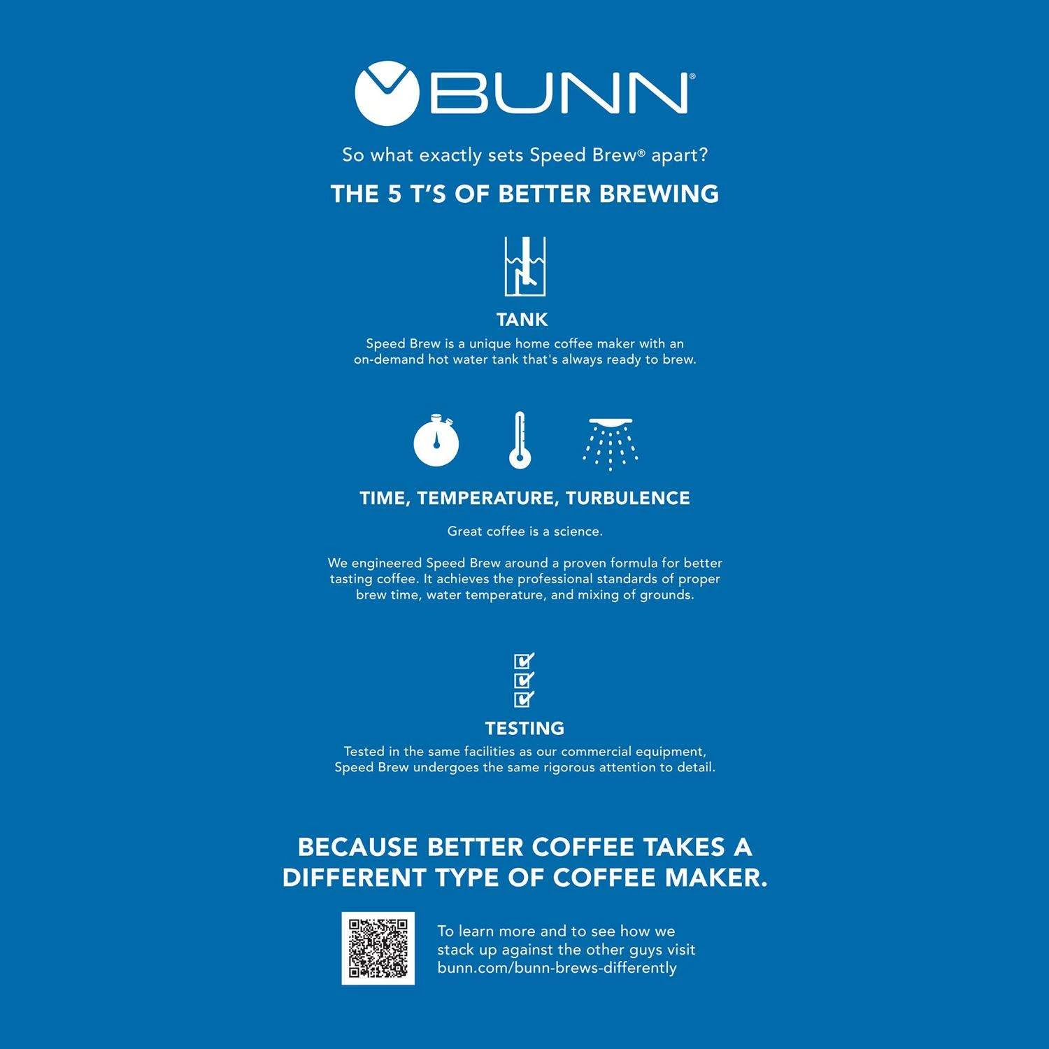 The fastest home coffee makers in America, now with an updated design. Speed brew coffee makers can brew 10 cups of coffee in about 4 minutes because they store hot water in a stainless steel commercial grade tank allowing them to brew coffee on demand. They’re always on your counter, always plugged in and always ready to brew the perfect cup of coffee. The BUNN Speed Brew uses an internal commercial grade stainless steel hot water tank that keeps 70oz of water always hot so you can quickly brew at the flip of a lid Vacuum-insulated, double walled thermal carafe maintains ideal serving temperature for 2+ hours Brew a full carafe of coffee in 4 minutes, half the time of typical coffee makers Commercial style multi-stream sprayhead evenly showers hot water over the coffee grounds to maximize the flavor of your coffee similar to your favorite cafe Brews 20oz to fill a travel mug in 2 minutes, or a full 50oz carafe in 4 minutes Engineered to accommodate BUNN filters which are 1/4” taller than other filters. This unique design allows for the quick flow of water and prevents overflow of coffee grounds Designed and assembled in the USA 3-Year Warranty