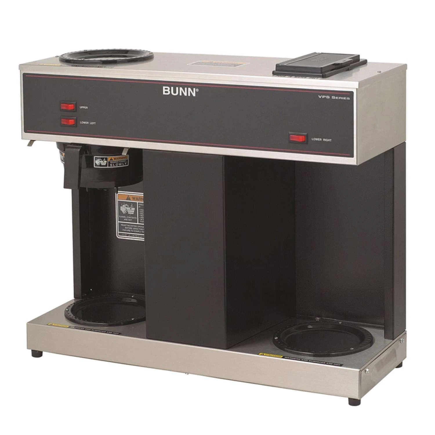 The popular BUNN VPS 12 cup pourover coffee brewer with three warmers features simple switch control office coffee service that does not require plumbing or special wiring. Decanters not included. Pourover brewer requires no plumbing – completely portable SplashGard® funnel deflects hot liquids away from the hand Three individually controlled warmers Servers not included
