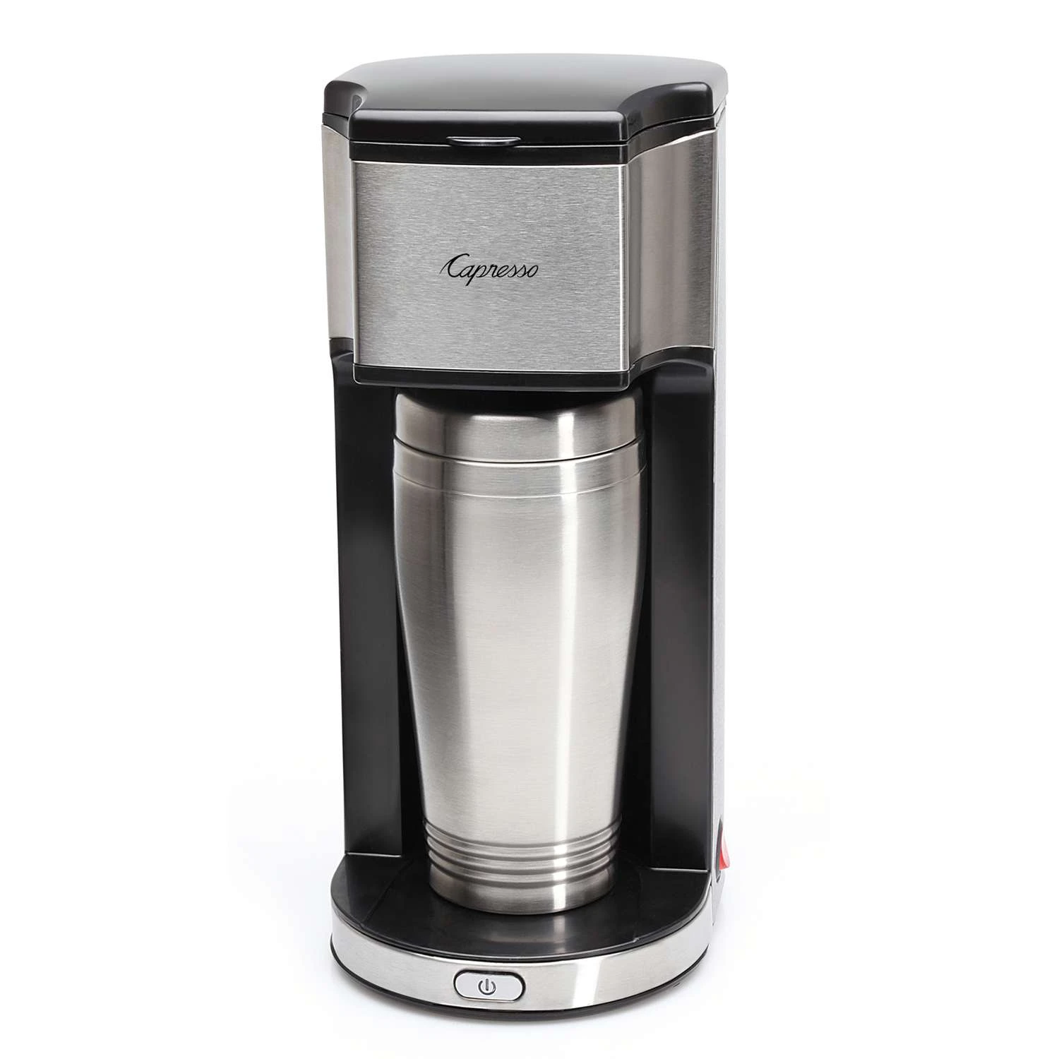 Large permanent filter can hold up to 6 tablespoons of medium ground coffee for maximum strength, adjust strength by adding less ground coffee. The On-the-Go also works with pre-packaged soft coffee pods for an even quicker brew and faster clean up. As an added convenience and safety feature, the unit automatically shuts off after the brew cycle is complete. It also includes an On/Off button to save energy when not in use. Use the mug to measure out the water before filling the water tank to ensure no coffee will overflow. Travel mug fits snuggly in most car cup holders Full stainless steel housing for superior strength and style Perfect for those on the go or those wanting a quick single cup at home Use included travel mug or your own mug (up to 7 tall) Heats up quickly to the perfect temperature of 200F for properly extracted coffee Brew with ground coffee or soft coffee pods Large shower head for perfect saturation and extraction Brews in less than four minutes Removable permanent filter is easy to use and clean, eliminates the need for paper filters Travel mug, coffee filter and removable filter basket are dishwasher safe