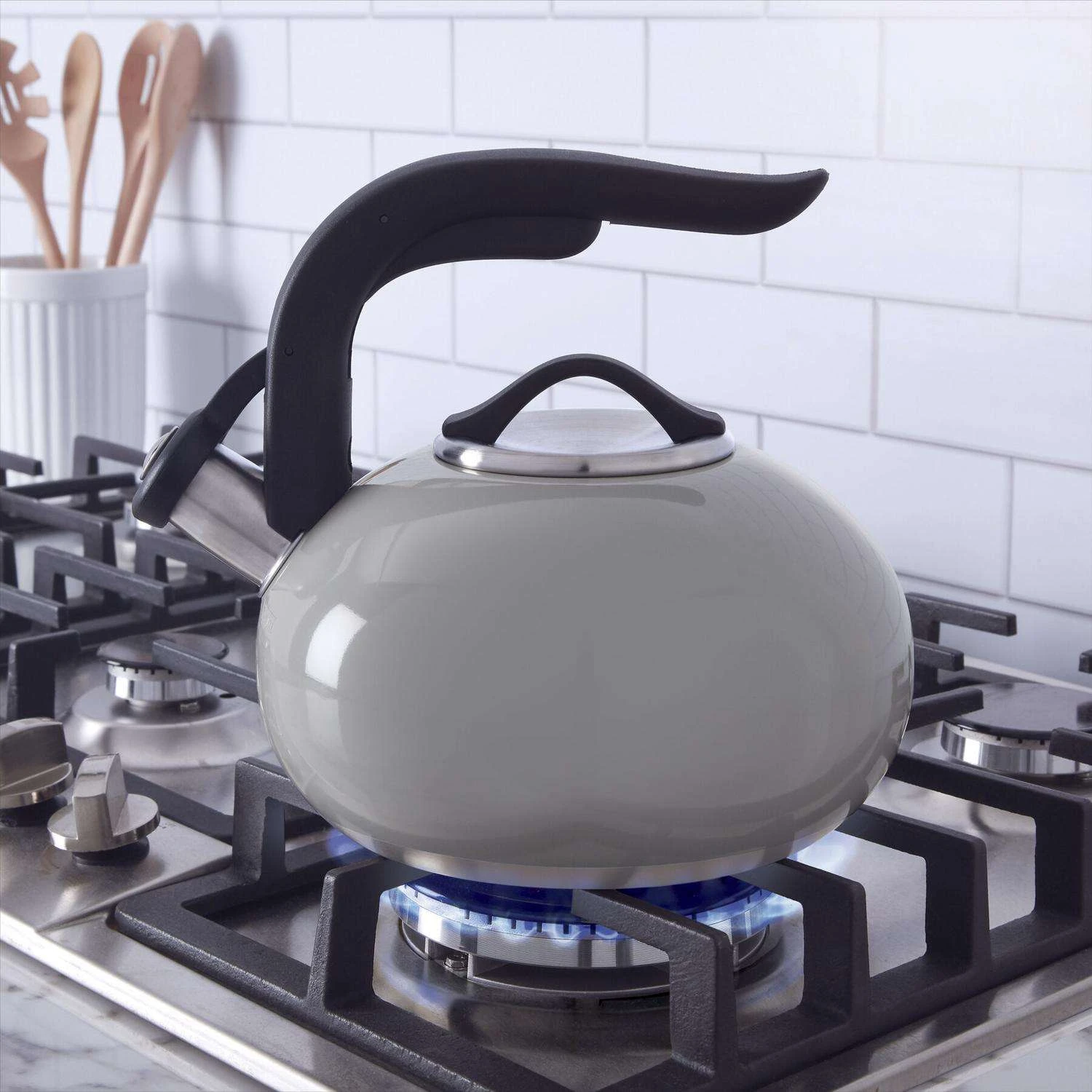 Crafted from durable, 18/10 stainless steel with a brushed finish, this kettle will complement any kitchen decor. Made from food-grade, 18/10 stainless steel, this kettle is rust-resistant. With pleasant audible whistle sound to alert you when the water has reached boil point and is temperature-ready for tea time. (1.7 L) stovetop tea kettle pot that makes 7 cups of hot water for delicious tea in minutes. This kettle is compatible with gas, electric, glass and induction stoves and features a tight-fitting stainless steel lid to prevent liquid spills and keep water warm for your next cup. Classic brush finish this durable stainless steel tea kettle features a sleek light grey color finish For gas and electronic cooktops Ergonomic handle nylon handle with one-hand trigger operation makes pouring simple and easy (use potholder to protect hands if water has just reached boil)