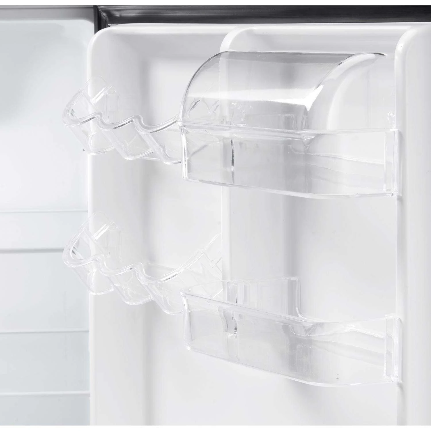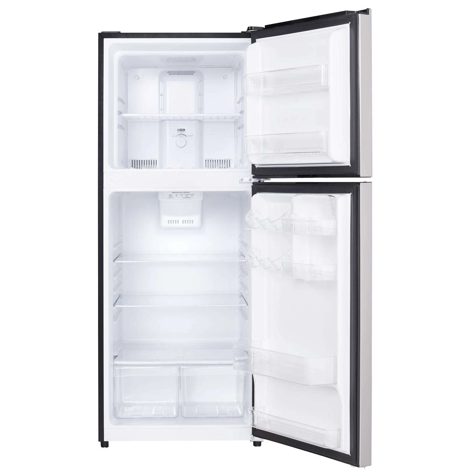 Discover the styling and simplicity of Danby’s 10.1 cubic feet (286 L) apartment-sized refrigerator, perfect for small space living in a condo, apartment or townhouse! The mid-size fridge is a smudge-free and modern stainless-steel look, handle-free opening and a reversible door with left and right-hand swings. Cut down on clutter with two and a half adjustable glass shelves, five integrated door shelves and two crisper drawers, offering maximum storage versatility. All your favorite frozen items can be stored with one shelf and two-door shelves, keeping your freezer accessible and organized. The state-of-the-art frost-free operating system is designed for improved food preservation and effortless maintenance, while the bright interior LED light illuminates the interior. This model can serve as your main fridge or as a second option to increase storage capacity. Apartment size 10.1 cu. ft. fridge with freezer capacity perfect for apartments, offices and small space living Frost free operation enjoy maintenance free use, this unit automatically defrosts in order to prevent ice build up Ample storage: 2.5 adjustable glass shelves with 5 door shelves, including tall bottle storage Seamless fit: reversible door for left and right swing Clean look clear vegetable crisper and interior LED lighting Smart design modern, smudge free, all black Controlled airflow specially designed interior provides the ultimate in controlled air flow without loss of space or storage capacity Better airflow means longer shelf life for all your groceries Handle-free opening with hidden hinge