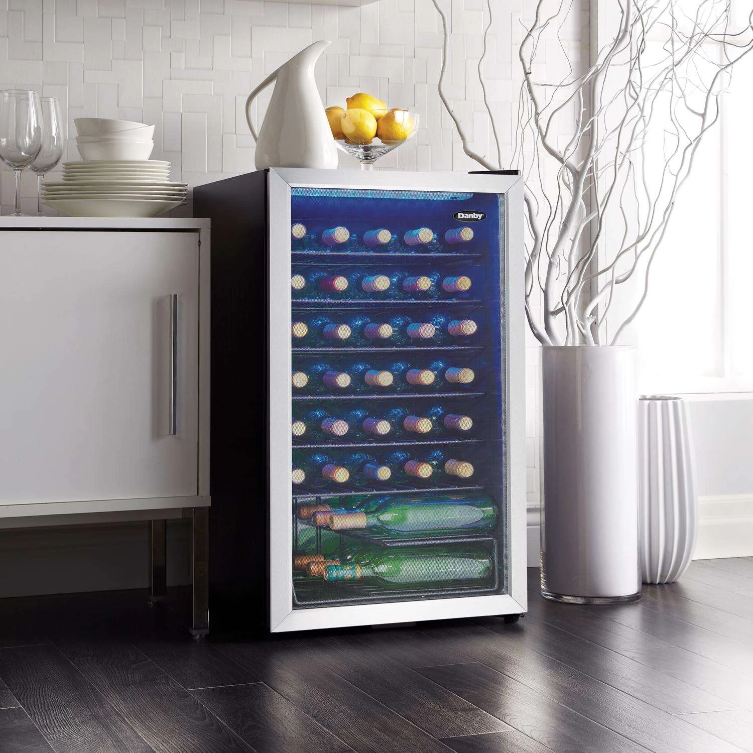 The best way to cool and display your precious wine collection is with Danby’s fashionable and convenient freestanding wine cooler. In addition, the thermostat allows you to easily program and maintain the internal temperature anywhere between 43F – 57F (6C – 14C). Plus, this appliance features a stylish recessed pocket-style handle and reversible door swing to allow you to open it from the left or right-hand side based on your preference. Durable black wire shelves Recessed pocket style handle The tempered glass door helps to protect the wine from harmful UV rays