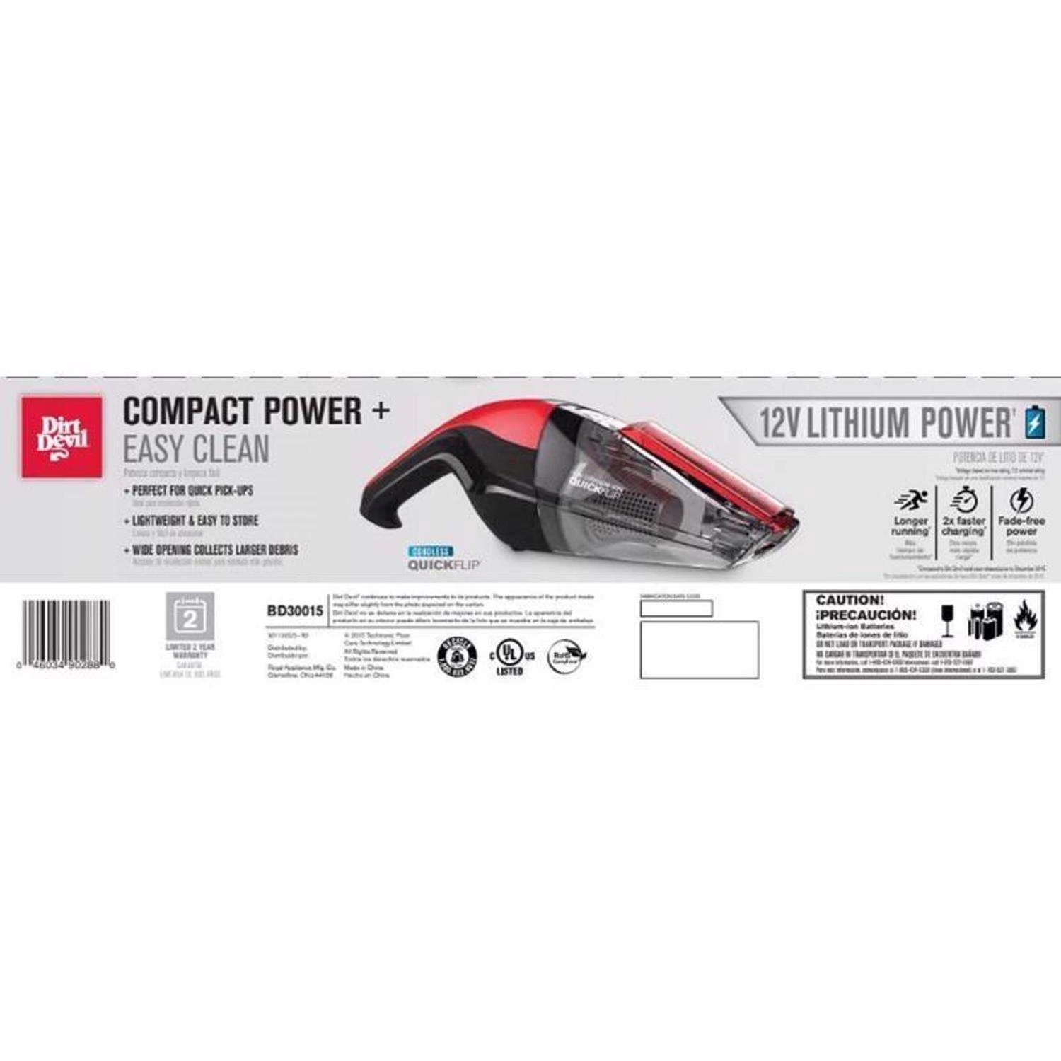 Easily tackle unexpected messes with the Dirt Devil Quick Flip Hand Vacuum. Perfect for small apartments, dorms and cars, this 12V Lithium-Ion cordless hand vac is powerful, compact and can easily tackle any unexpected mess. The versatile Quick Flip crevice tool is stored right on the unit just flip out the tool and click it into place to easily reach debris in crevices and tough corners. It is that simple. And a special designed handle fits perfectly in the palm of your hand while an easy empty dirt cup makes it even more convenient to get the job done quicker. For faster charging, longer runtime and fade-free power Lightweight design easily carry from one mess to the next Easy to handle This item cannot be sold on any web site without direct authorization from the vendor and MAP retail pricing must be followed when published.