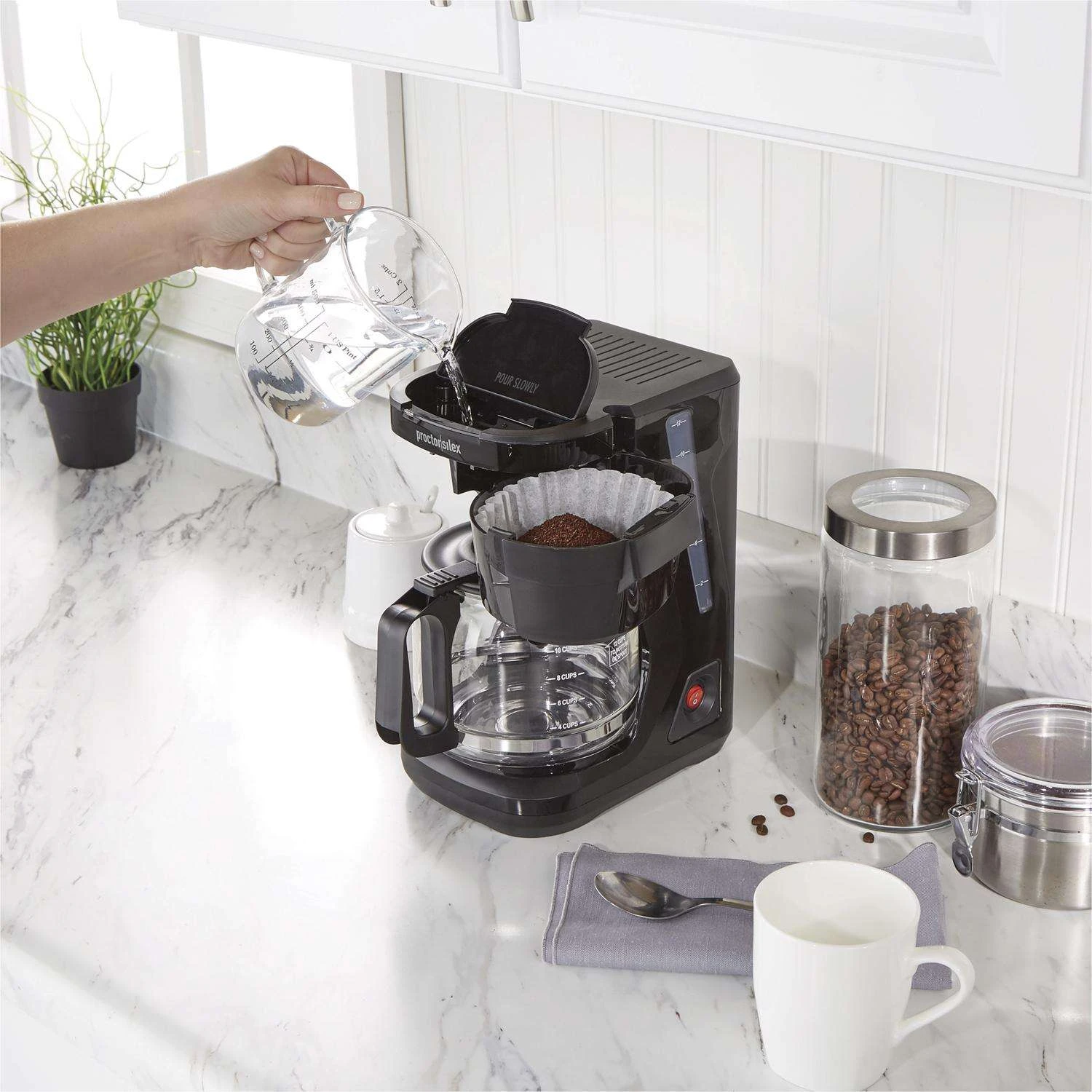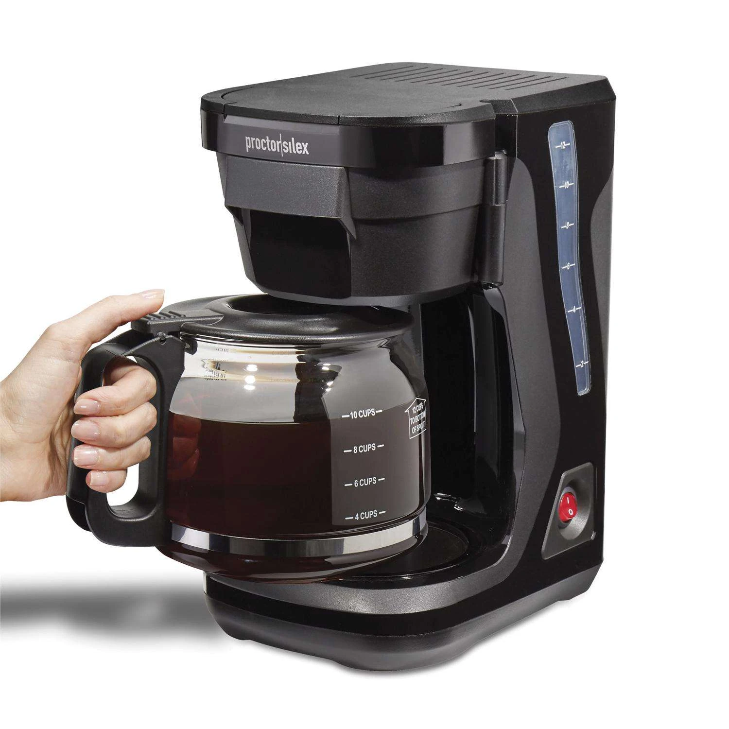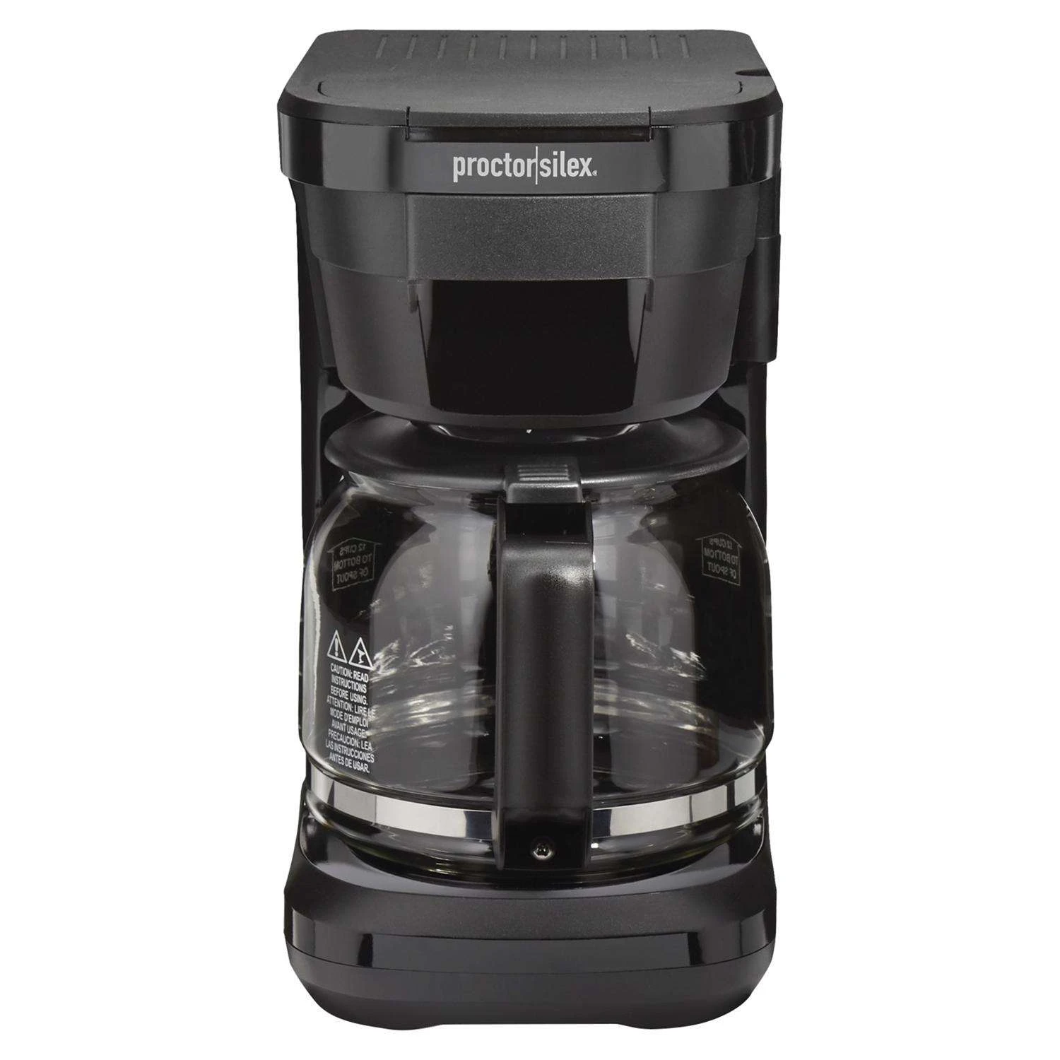 The Proctor Silex Front Fill compact 12 cup coffee maker is easy to fill without moving. To save space when not in use, the carafe handle stores neatly inside the base. It keeps coffee warm in the carafe until you’re ready for your next cup. Filling is easy with Front Fill water reservoir and swing-open brew basket Saves space in the kitchen compact design easily fits under countertops and handle stores inside base Easy to clean with dishwasher safe carafe and brew basket Get your first cup fast with auto pause and pour Easily see whether the coffee maker is on or off Easy-to-clean nonstick warming plate