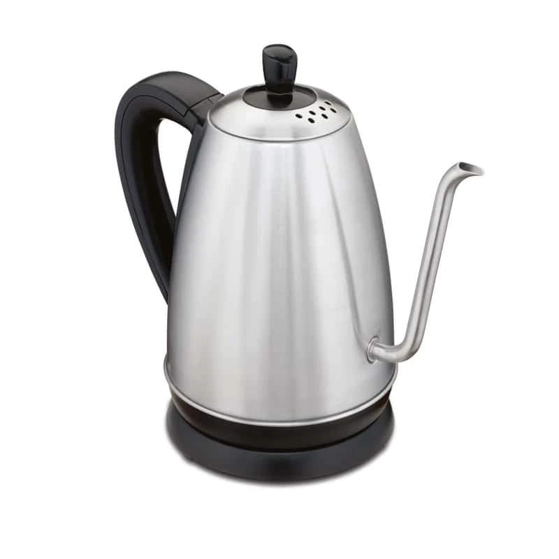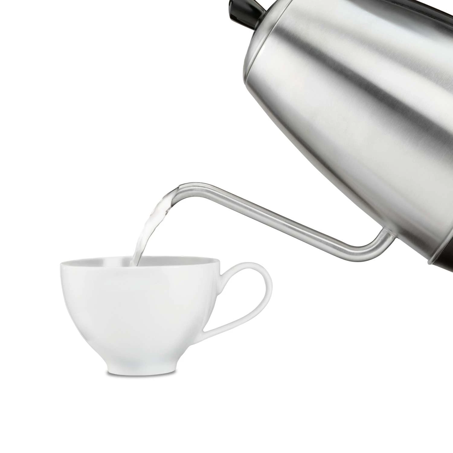 The Gooseneck Kettle’s heating unit is concealed in the base, creating a safe and efficient way to heat water quickly. It then automatically shuts off once the water has boiled. The red light lets you know when the power is on or off. Bring the craft of manual-coffee making to your own counter with the same precise control baristas use. The gooseneck design creates the slow, steady stream necessary for delicious pour-over coffee. For those who need hot water fast, this electric kettle is for you. The kettle easily and safely lifts off the heating base, making it perfect for placing on the table for gatherings or sharing on busy weekday mornings. Store your kettle nice and neat thanks to the cord wrap at the kettle’s base. Faster than a microwave, safer than a stovetop kettle Perfect for pour-over coffee, tea, hot cocoa & more Gooseneck spout provides precise pouring control Auto shutoff when water boils Cord-free serving