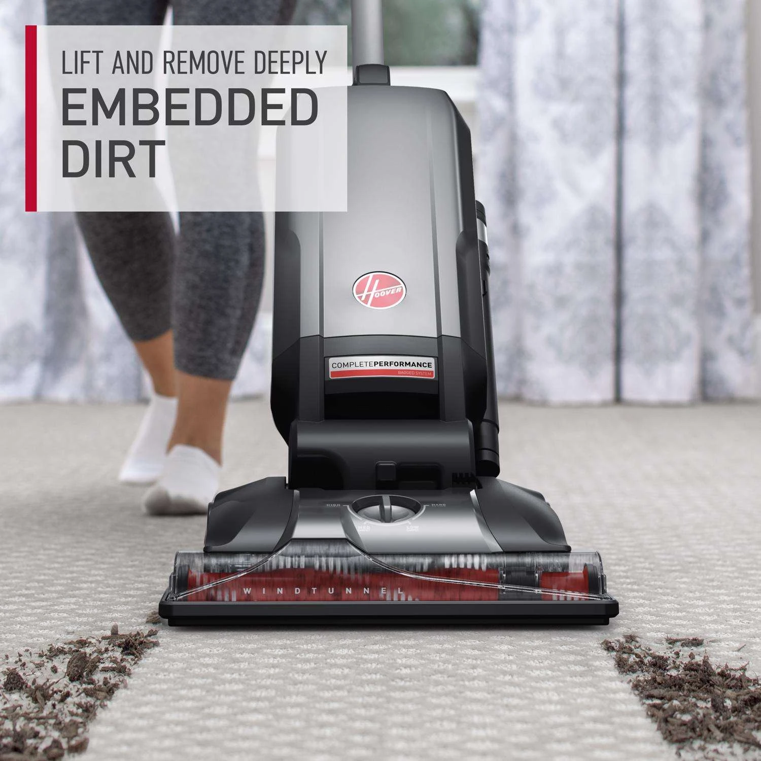 The Hoover Complete Performance Advanced Upright Vacuum Cleaner delivers powerful suction to power through tough messes to lift and remove deeply embedded dirt, while trapping over 99.97% of dust and particles with the HEPA Media Bag. Move from carpet to hard floors with the help of the 4-level height adjustment so you can get an effective clean on any floor type. With the on-board hose and tools, you can extend your clean up to 12 ft above floors to tackle messes on furniture, stairs and more. Once your bag is full, simply drop your bag into the trash with our easy release bag for easy maintenance and a mess-free disposal. Bag made with HEPA Media, which captures 99.97% of dust and particles down to 0.3 microns, from the air that passes through it Clean drop bag system – dispose of a full bag without ever touching it 2X more suction to remove deeply embedded dirt