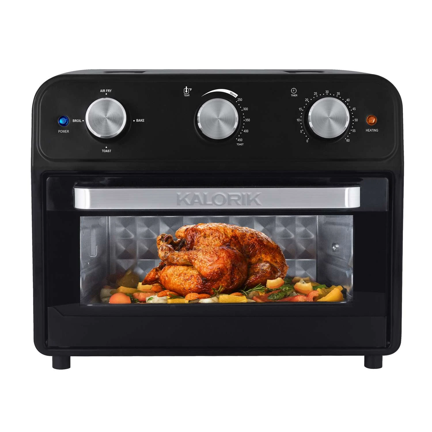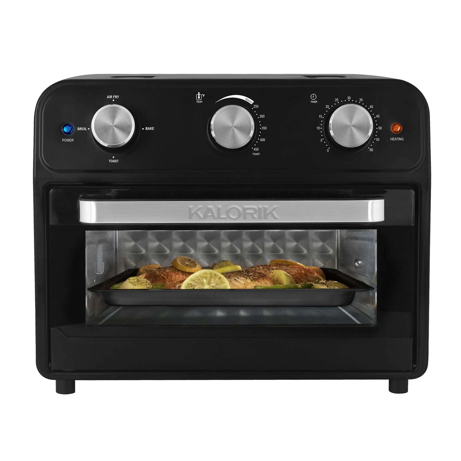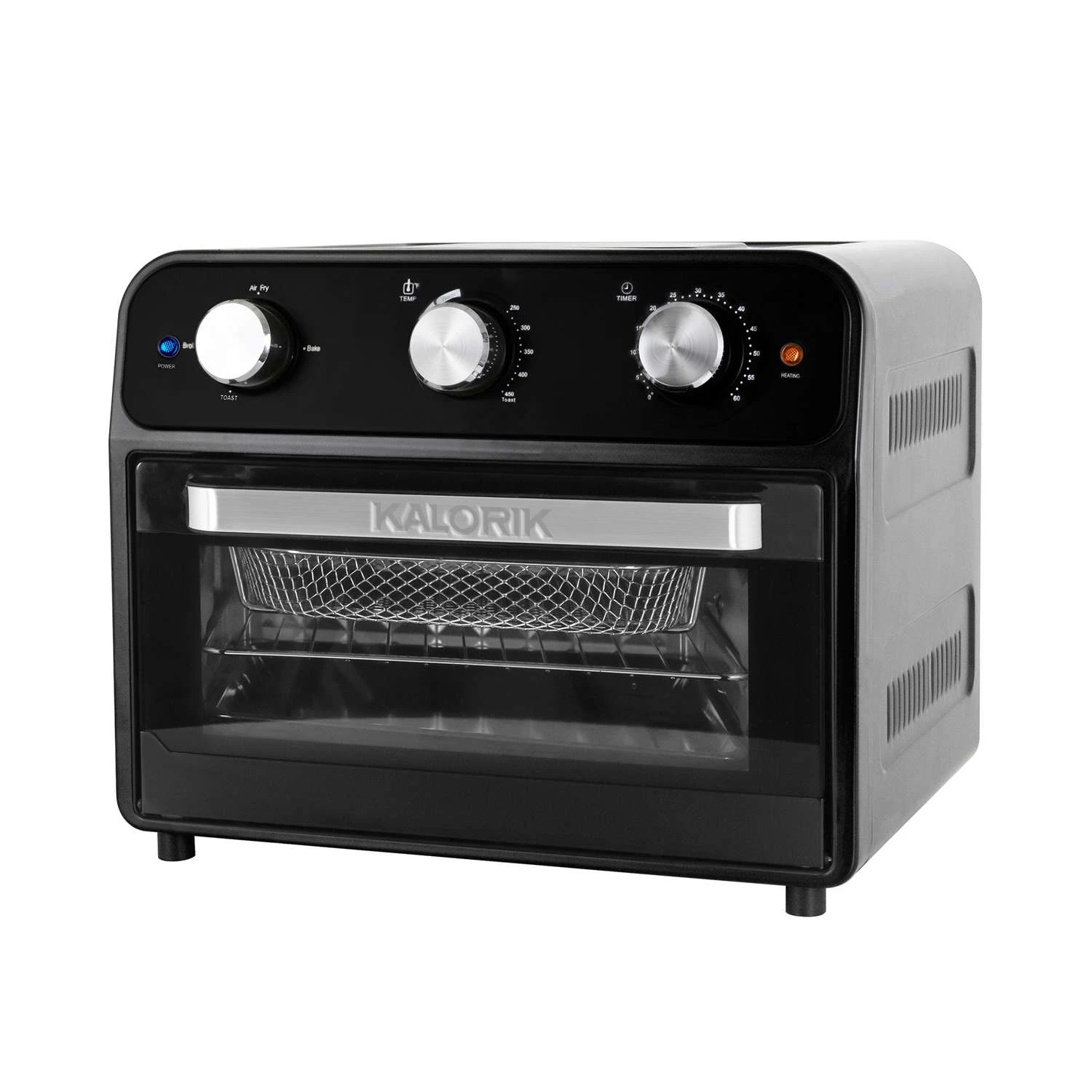 Fry, bake, toast and broil with the Kalorik 22 Quart Air Fryer & Toaster Oven. This innovative and multifunctional appliance uses Rapid Hot Air Technology to cook food faster and make meals healthier. The air frying mechanism works by circulating super hot air around your food. This delivers the same crispy texture and rich flavor of your favorite fried foods – with little to no oil. That means less fat and calories! The Kalorik 22 Quart Air Fryer & Toaster Oven not only functions as an air fryer, it can also be used as your regular, everyday toaster/convection oven. The appliance features easy-to-use chrome-plated knobs with toast, air fry, bake and broil functions. The Kalorik 22 Quart Air Fryer & Toaster Oven contains six heating elements – four on top, two on the bottom. A built-in 60-minute timer and adjustable thermostat of up to 450°F let you customize cooking for every dish. Meanwhile, a glass door allows for easy monitoring. An auto-shutoff safety feature automatically stops operation when the door is open. The appliance comes with a baking pan, air frying basket, air rack, tray handle and crumb tray. Multi-functional air fryer oven can fry, bake, toast and broil Rapid hot air technology cooks food up to 30% faster Creates perfectly crisp fried food with little to no oil, reducing fat by up to 75% Can be used as your everyday toaster/convection oven Chrome-plated knobs feature a 60-minute timer and adjustable thermostat (250F-450F) Glass door let you easily monitor food while cooking Auto-shutoff safety feature automatically stops operation when door is open