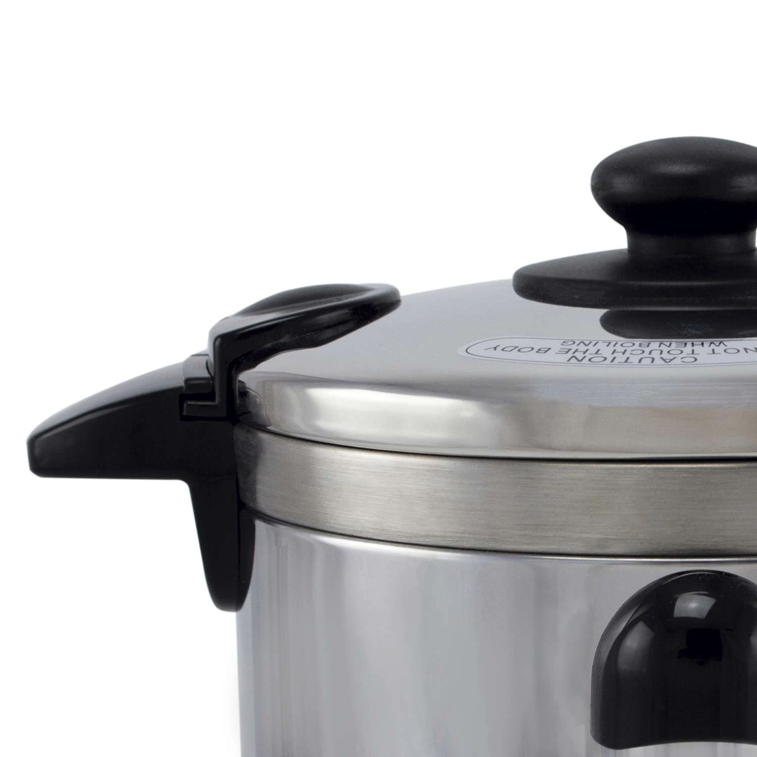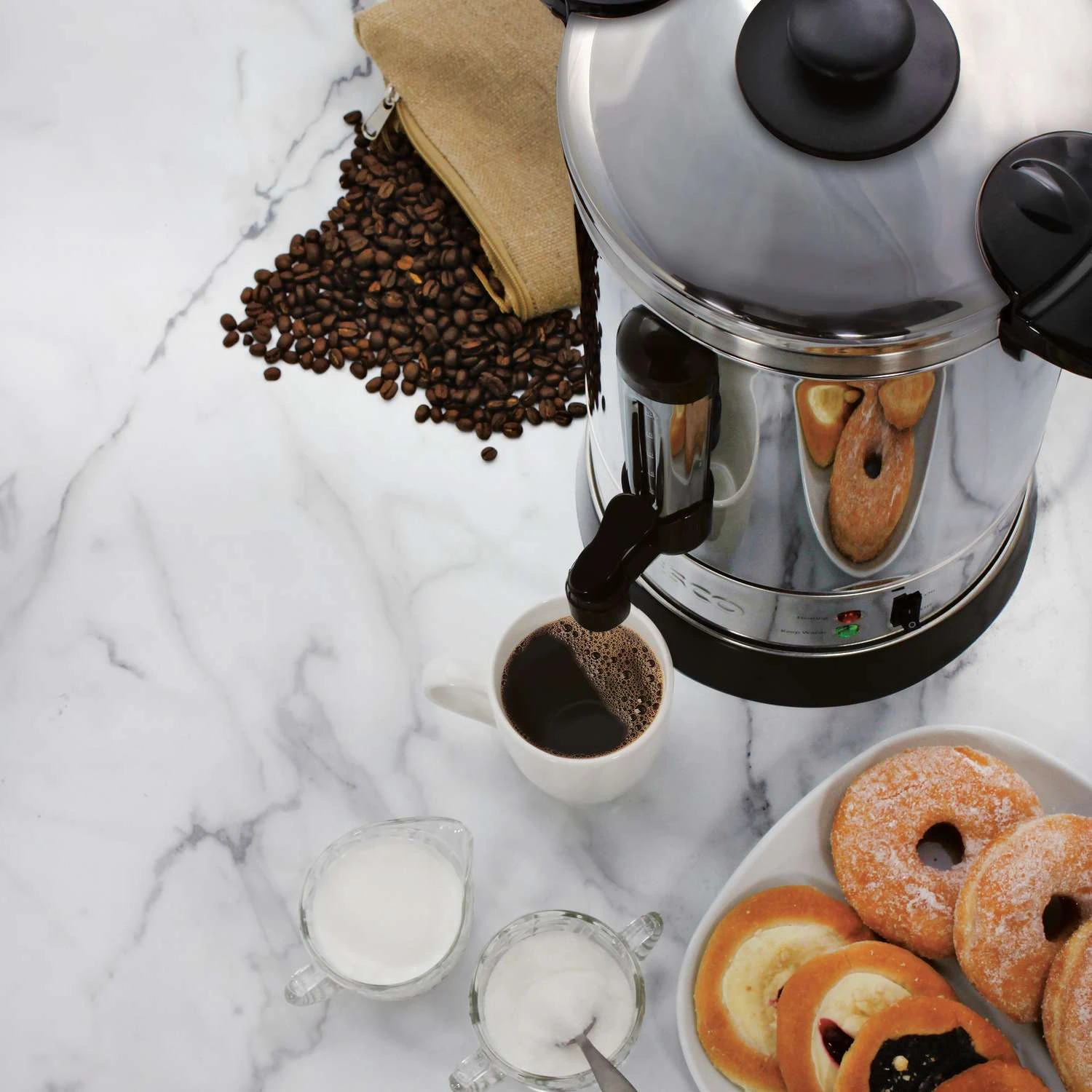 The Nesco 30 Cup Coffee Urn is perfect for large social gatherings, business meetings or family parties. Its hefty capacity can hold up to 30, 5.7 oz. cups. Approximate brewing time is one cup per minute. The stainless steel urn base features a double insulated wall that retains heat and has a 950 watt heating element that will keep your coffee hot and fresh for hours of enjoyment. The easy-to-use dispenser and drip-free spout with continuous pouring option provides a perfectly poured cup of coffee every time. The ready-to-serve indicator light will illuminate green when coffee is ready to be poured and enjoyed. The coffee level indicator visually shows how much coffee is left in the urn. A convenient drip tray collects splashes and spills ensuring a clean countertop. The stainless steel coffee basket is removable and dishwasher safe making cleanup easy and quick. Additional features include water level marks for easy filling and stay-cool handles to help prevent mishaps. The Nesco 30 Cup Coffee Urn a real crowd pleaser that keeps coffee fresh and flavorful all day long. Double wall insulation & 950 watt heating element Drip-free spout with continuous pour option & coffee On/off switch with heating & ready-to-serve indicator lights Dishwasher safe stainless steel coffee basket Stay-cool handles & locking lid