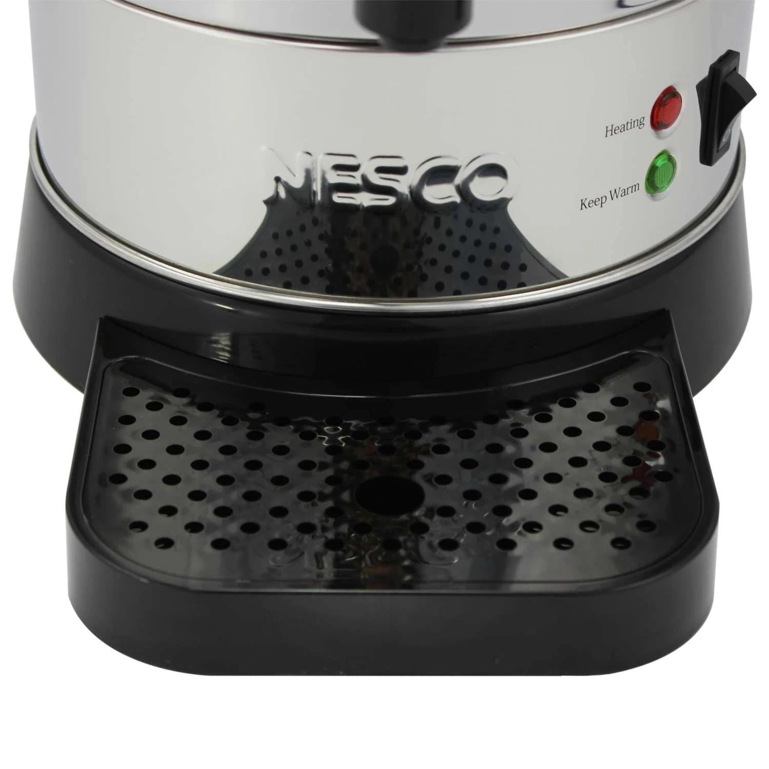 The Nesco 50 Cup Coffee Urn is perfect for large social gatherings, business meetings or family parties. Its hefty capacity can hold up to 50, 5.7 oz. cups. Approximate brewing time is one cup per minute. The stainless steel urn base features a double insulated wall that retains heat and has a 950 watt heating element that will keep your coffee hot and fresh for hours of enjoyment. The easy-to-use dispenser and drip-free spout with continuous pouring option provides a perfectly poured cup of coffee every time. The ready-to-serve indicator light will illuminate green when coffee is ready to be poured and enjoyed. The coffee level indicator visually shows how much coffee is left in the urn. A convenient drip tray collects splashes and spills ensuring a clean countertop. The stainless steel coffee basket is removable and dishwasher safe making cleanup easy and quick. Additional features include water level marks for easy filling and stay-cool handles to help prevent mishaps. The Nesco 50 Cup Coffee Urn a real crowd pleaser that keeps coffee fresh and flavorful all day long. Double wall insulation & 950 watt heating element Drip-free spout with continuous pour option & coffee On/off switch with heating & ready-to-serve indicator lights Dishwasher safe stainless steel coffee basket Stay-cool handles & locking lid