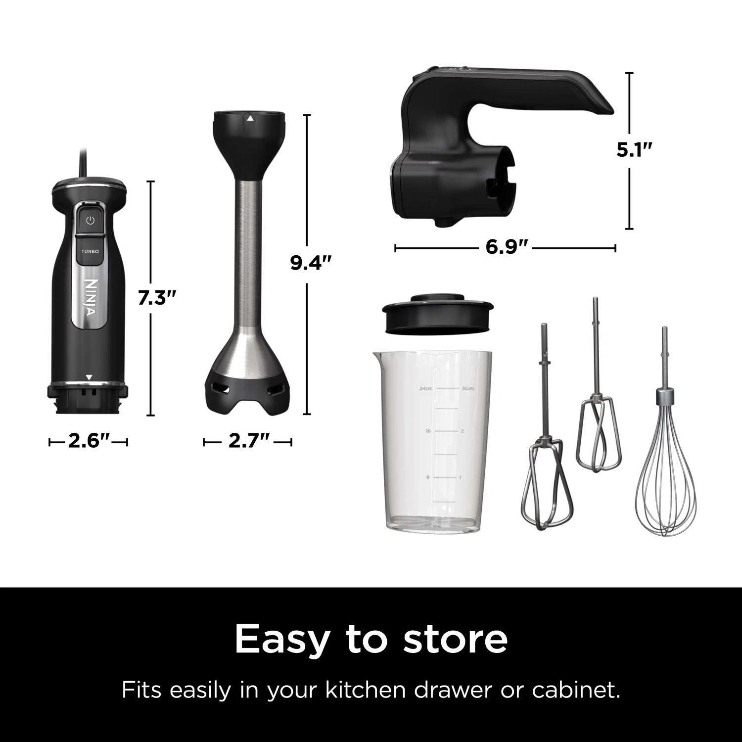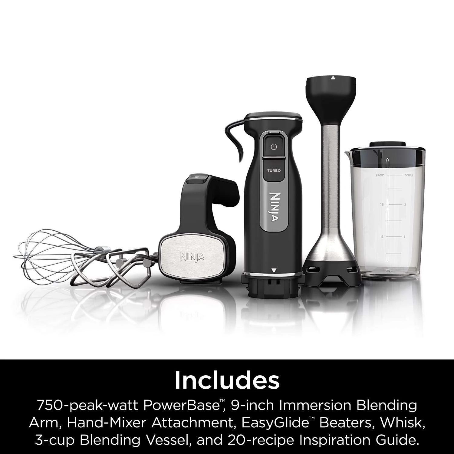 | What's Included | Powerbase with 5 ft. Cord, 9 in. Immersion Blending Arm with Stainless Steel Blade And Built-in Pan Guard, Hand Mixer Attachment with Whisk & EasyGlide Beaters, 3-cup Blending Vessel with Storage Lid and 20-recipe Inspiration Guide |