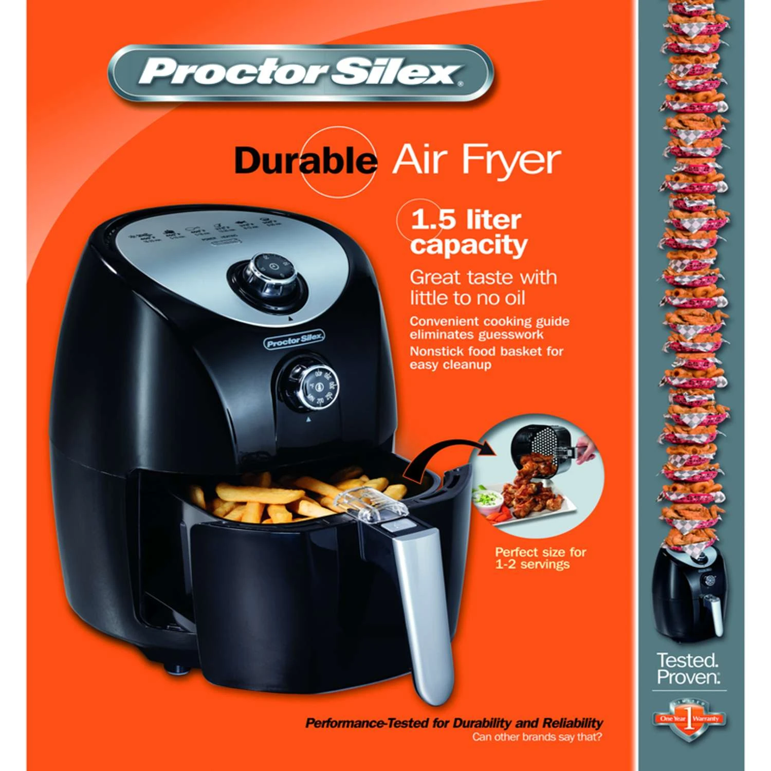 Make all your deep-fried favorites using little to no oil in the Proctor Silex. 1.5 L Capacity Air Fryer. Powerful airflow circulates around the nonstick frying basket for perfectly crisp French fries, wings, mozzarella sticks, veggies and more. Perfect size for 1 to 2 servings Great taste with little to no oil Fast preheating and cooking with 900 watts Indicator lights for power and heating